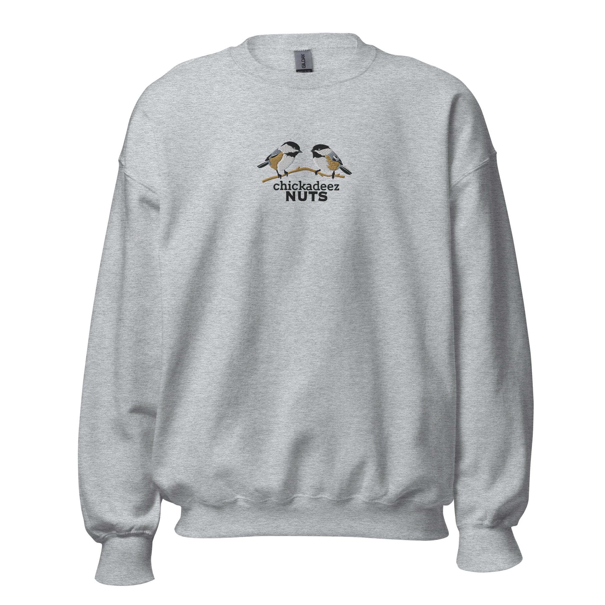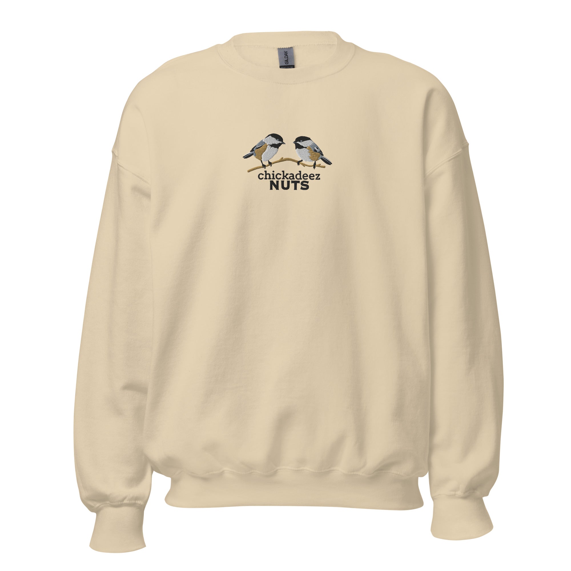This Chickadeez NUTS embroidered crewneck sweatshirt is the definition of looks-innocent-until-you-read-it. Featuring two delicately stitched chickadees and a caption that lands with a delayed reaction, this sweatshirt is made for people who appreciate humor that sneaks up on you.